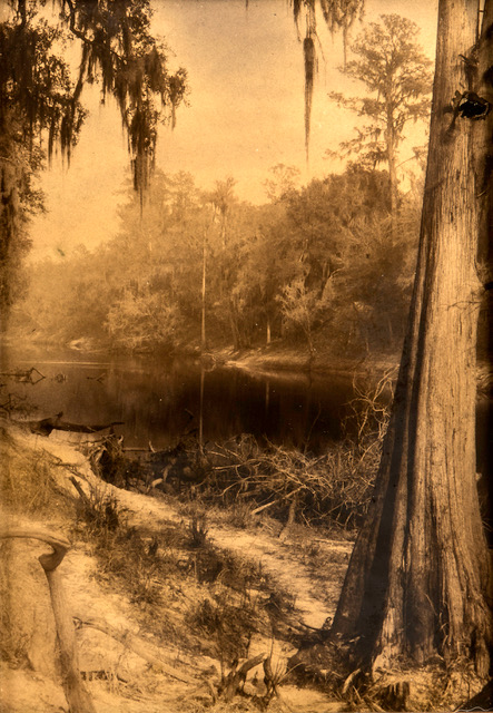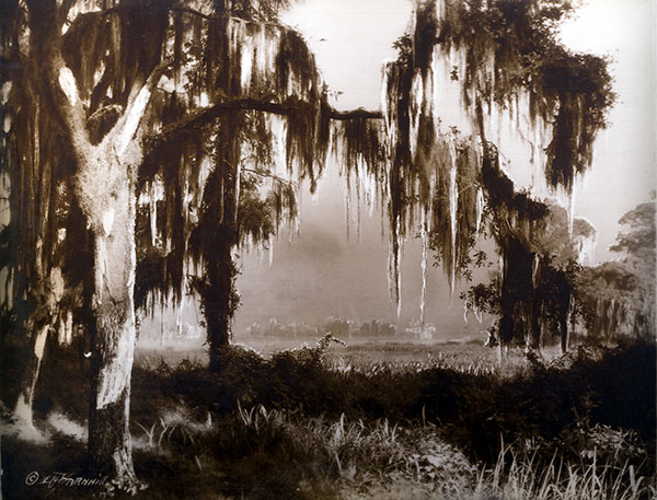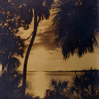EG Barnhill (1894-1987) was the most interesting Florida tourist-art photographer in the early part of the 20th century. Known for his gold toned glass plates and hand painted glass plate landscapes using uranium pigments, his landscapes show an unearthly luminescence and are wonderful metaphors for Florida light. Each uranium pigment plate is unique, varying by the application of color.